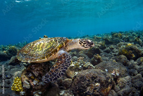 Hawksbill Turtle - Eretmochelys imbricata. Underwater world of Tulamben, Bali, Indonesia.