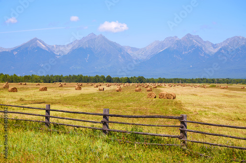 Haystacks with straw in an agricultural field. Picturesque rural landscape, mountains, blue sky.