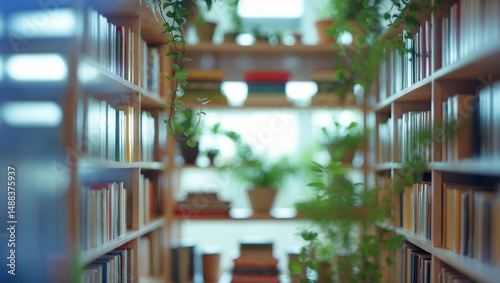 Hazy background of a tastefully organized bookshelf displaying a selection of books, accompanied by natural light and potted plants, establishing a peaceful and inviting setting.