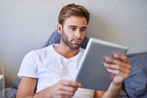 20s, adult, alone, bed, bedchamber, browsing, brunette, carefree, caucasian, connected, content, cool, copy space, cropped, electronic mail, sharpened, guy, photogenic, holding, home, indoor, inside, cyberspace, lifestyle, looking, lying, male, man, modern, morning, 1, online, pajama, people, person, pillow, reading, relaxation, sheet, sitting, student, technology, touch screen, t-shirt, web, wireless, young