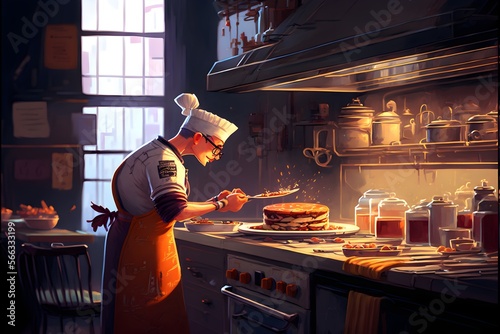 chef, kitchen, cooker, cooking, eatery, food, work, head, meat, business, bar, hot drink, working, man, woman, cafeteria, client, people, cafes, order, dessert, pressure, plate, knife, fork, spoon, frying pan, pan, oven, fire, fries, browning, service, art, wallpaper, background, illustration, ai, generative
