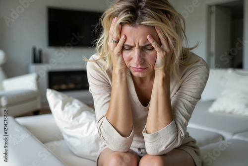 woman, cephalalgia, migraine, contemporary, living room, dishevelled, hair, pain, discomfort, female, electronic mail, modern, room, elegant, setting, vulnerability, luxury, interior, sofa, home, indoor, attack, health, age, emergency, rescue, disease, unhealthy, ailment, daughter, disaster, hospital, resuscitation, health care