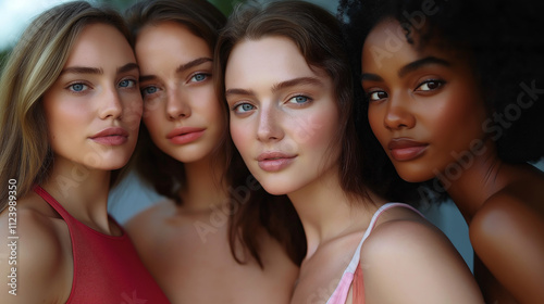 woman, diversity, beauty, fashion, model, posing, head shot, portrait, ethnicity, race, skin, make-up, natural, female, girl, young adult, multiracial, group, friends, togetherness, cosmetic, skincare, hair, style, glamour, trendy, lifestyle, studio shot, contemporary, attractive, confident, feminine, sisterhood