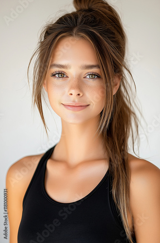 Headshot Portrait of a Young Woman with Dark Brown Hair, Light Freckles, and Makeup – Sleek Ponytail and Confident Expression on a Minimal Beige Background