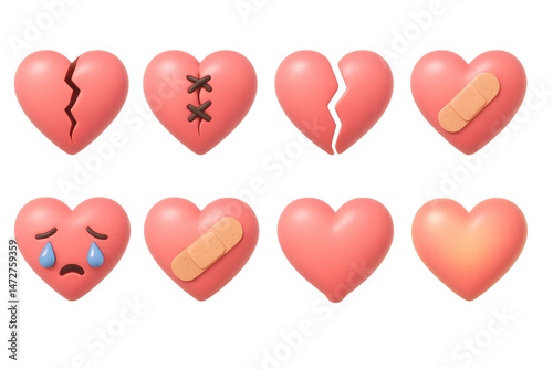 Healing heart icons set – broken, stitched, mended, crying, bandaged. 3D icon set