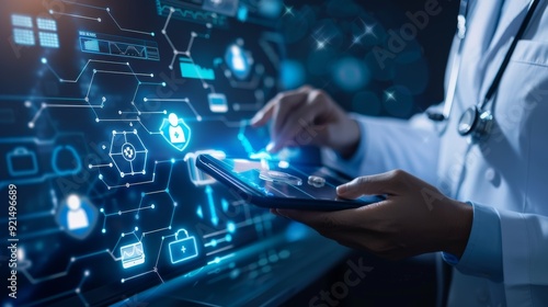 Health care and medical technology services concept. Medical worker using data virtual with health care icons, medical technology background, health insurance business.Health Insurance, telemedicine
