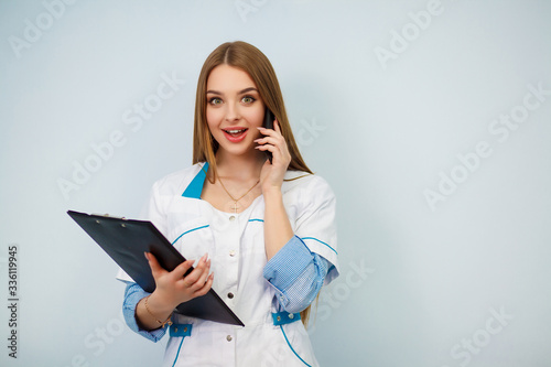 Health care concept. Beautiful girl in a white coat. Copy space. Photo of a young woman doctor posing isolated over white wall background holding clipboard talking by mobile phone