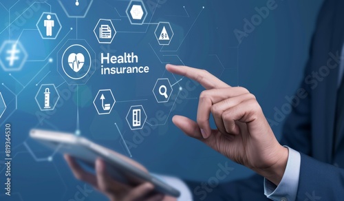 Health insurance,Businessman touching on virtual screen with text "Health insurance", hexagon and icons of business, personal accident, medical, farm setting. formal wear concept for money bad resol