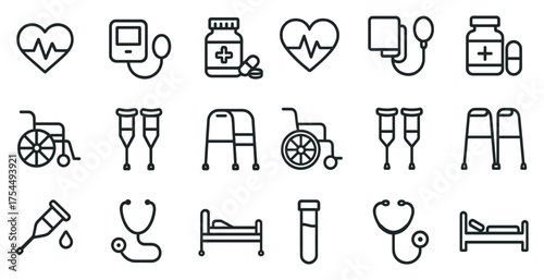 health care, outline, linear, icon, set, vector, design, equipment, hospital, patient, doctor, nurse, aid, emergency, health care, stethoscope, wheelchair, crutch, pharmacy, treatment, medicine, clinic, diagnostic