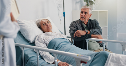 Healthcare, doctor and senior couple in hospital, conversation and advice for cancer treatment. Pensioner, medical emergency or old woman in bed, elderly man and consultation with illness or recovery