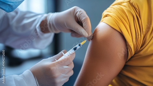 healthcare professional administering vaccine injection in upper arm of patient wearing yellow shirt promoting preventive medicine and public health campaign