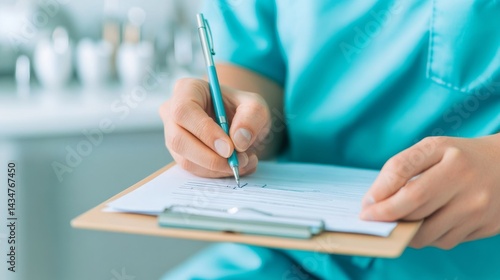 Healthcare professional documenting patient information medical office image bright environment close-up clinical practice