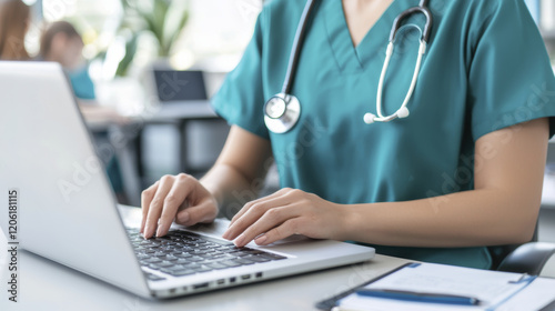 health care, professional, laptop, typing, scrub, stethoscope, office, medicals, technology, computer, work, hand, closeup, desk, patient, information, nurse, doctor, clinic, communication, datum, equipment, modern, workspace, health, service, support, analysis, research, documentation, writing, care, system, organisation, task, environment, productivity, connection, management, team, collaboration, efficiency, digital, tool, software, field, clinical, service, workplace