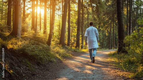 Healthcare professional strolling on a sunlit forest path, tall trees create a serene atmosphere, ample space for text on the right side, promoting wellness and nature connection