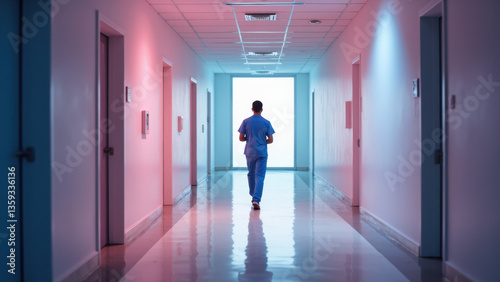 healthcare professional walks down brightly lit hospital corridor, showcasing serene and focused atmosphere