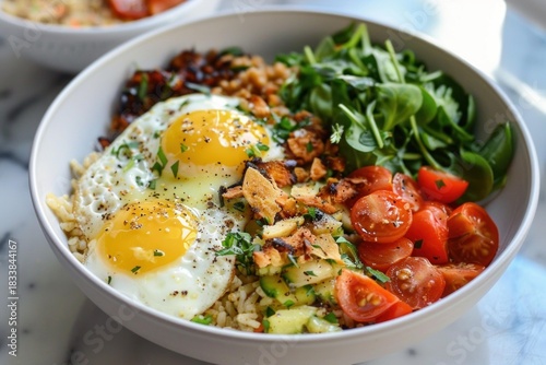 Healthy and colorful breakfast bowl featuring fried eggs, brown rice, roasted vegetables, fresh salad, and crispy pita chips