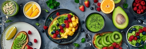 Healthy and Vibrant Breakfast Spread with Avocado Toast and Assorted Fruits