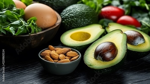 Healthy avocado, eggs, almonds, spinach, tomatoes on dark wood; recipe, blog