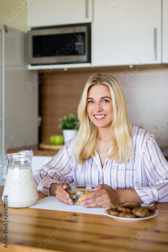 attractive, background, beautiful, beauty, blond, bowl, breakfast, care, caucasian, cereal, concept, cookie, corn, cornflake, delicious, diet, drink, eat, female, flake, food, fresh, girl, happy, health, healthy, home, indoor, interior, jug, kitchen, lifestyle, meal, milk, morning, natural, nourishment, 1, organic, pajama, people, person, sitting, smiling, spoon, table, tasty, white, woman, young