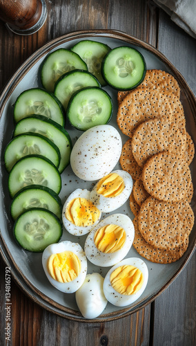 healthy breakfast platter featuring boiled eggs, fresh cucumber slices, and crunchy crackers, perfect for nutritious start to day. Enjoy vibrant colors and textures