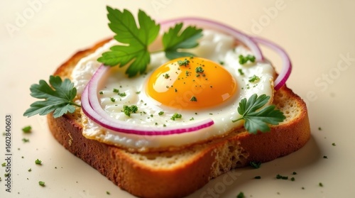 Healthy Breakfast Toast with Fried Egg, Green Peas, and Red Onion