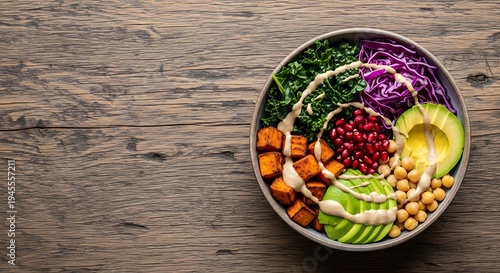 buddha, bowl, kale, avocado, cabbage, pomegranate, chickpea, potato, healthy, vegan, vegetarian, nourishment, diet, meal, wood, wooden table, copy space, rustic, dressing, sauce, fiber, fitness, wellness, epicure, culinary, tasty, colourful, purple, green, orange, protein, fresh, organic, vitamin, salad, lifestyle