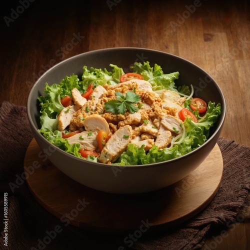 Healthy chicken, vegetable salad served in dark bowl on wooden table. Fresh lettuce, sliced tomatoes, grilled chicken breast pieces, savory topping. Delicious, nutritious meal perfect for lunch