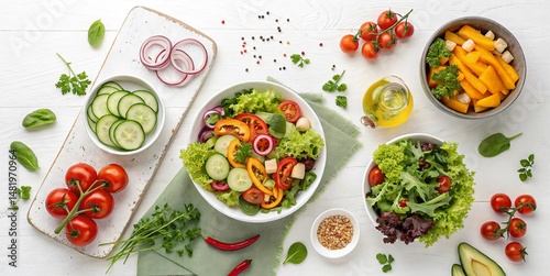 Healthy clean vegetarian food and diet nutrition concept. Various fresh vegetables ingredients for salad on white table background banner white background