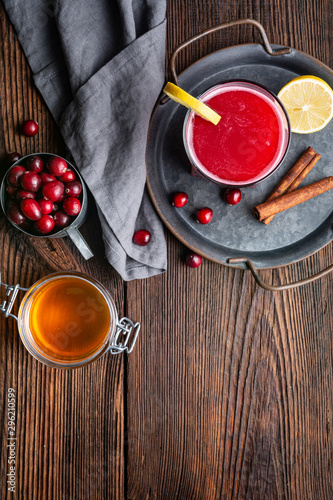 Healthy drink for urinary tract health, homemade cranberry juice with lemon and cinnamon, sweetened with honey with copy space