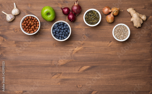nourishment, food, vegetable, eating, vegan, vegetarian, healthy, health, health care, care, energy, ingredient, cooking, harvest, fruit, antioxidant, bio, concept, background, fresh, vitamin, raw, diet, product, nutrient, detox, vegetarian, organic, up high, topview, taste, clean, nut, berry, ginger, garlic, onion, apple, wooden