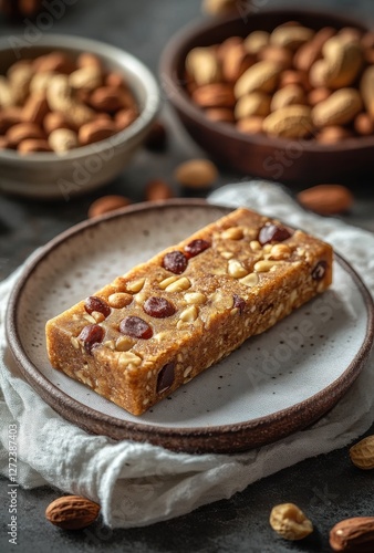 Healthy Energy Bar with Nuts and Dried Fruits on a Rustic Plate Surrounded by Various Nuts in a Natural Setting