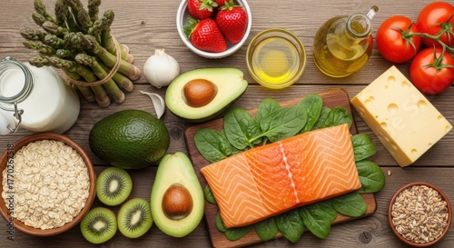 healthy, food, salmon, fish, protein, avocado, fruit, strawberry, berry, asparagus, vegetable, oat, grain, olive, oil, cooking, ingredient, meal, diet, nourishment, fresh, organic, natural, raw, cookery, dish, preparation, kitchen, table, wooden, surface, still, life, variety, assortment, group, collection, component, element, vitamin, mineral, omega, fiber, antioxidant, appetence