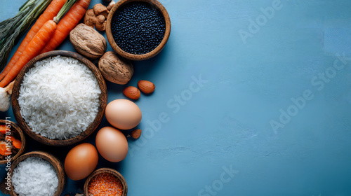 food, health food, nourishment, ingredient, diet, rice, egg, carrot, lentil, walnut, bowl, wooden bowl, blue background, healthy eating, balanced diet, copy space, topview, cookery, meal, dinner, breakfast, lunch, vegetable, grain, protein, cooking, receipe