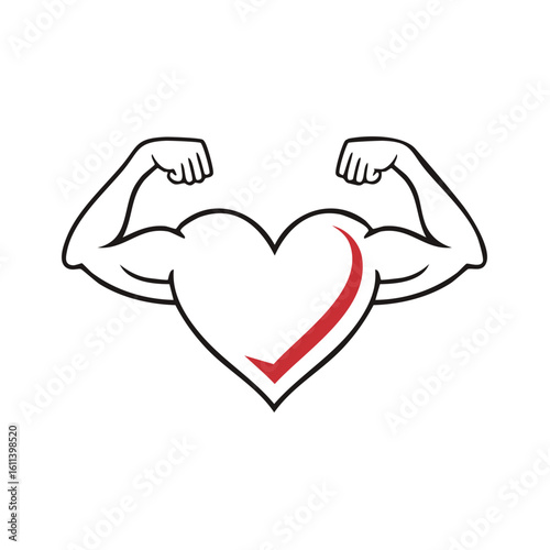 Healthy heart symbol with strong bicep arms flexing for fitness and cardiology
