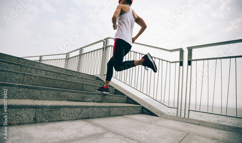 Healthy lifestyle fitness sports woman runner running up stairs on seaside trail