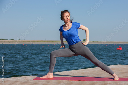 Healthy lifestyle in nature,Woman doing yoga exercise on mat in park near lake.