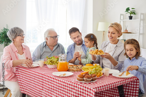 Healthy meal together at home, big three generation family enjoying lunch break, supper at home ordering takeaway food, daily ready menu food delivery service at home, excited day with dinner delivery