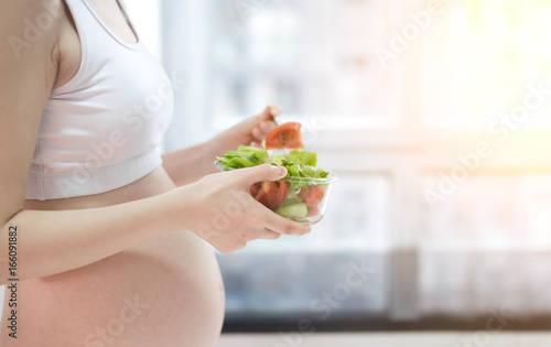 healthy nutrition and pregnancy. pregnant woman's belly and vegetable salad