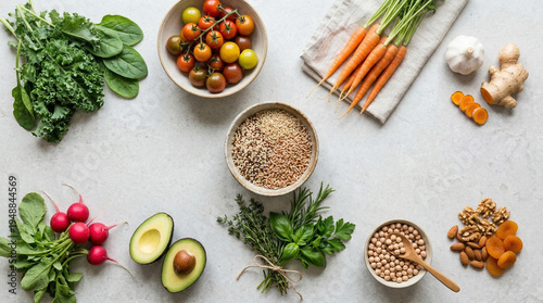 health food, fresh vegetable, grain, herb, natural food, nourishment, healthy lifestyle, cooking ingredient, topview, copy space, vegetarian food, fresh produce, photorealistic, no people