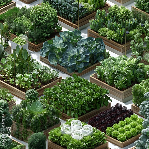 Healthy organic vegetables growing in rows inside white bordered raised garden boxes high resolution photo