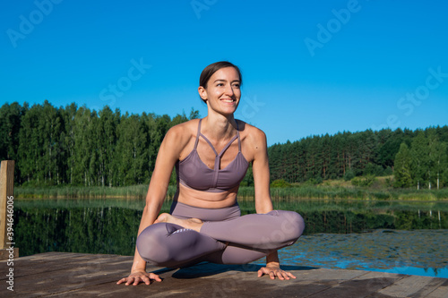 Healthy woman practicing yoga on the lake at sunrise enjoying positive energies from nature