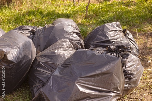 bag, plastic, black, heap, garbage bag, trash bag, pile, garbage, trash, full, outdoors, grass, cleaning, cleanup, ground, environment, environmental, pollution, many, nobody, bin, dump, green