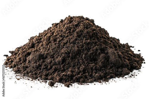 Heap of dark, rich soil with fine texture isolated on a white background for gardening, landscaping, and agricultural purposes