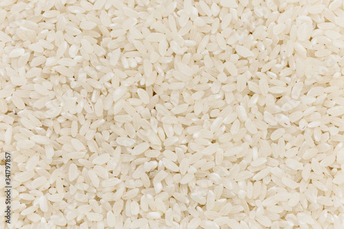 Heap of white glutinous rice close-up as background. Organic white rice, glutinous rice or sticky rice for design nature foods background.