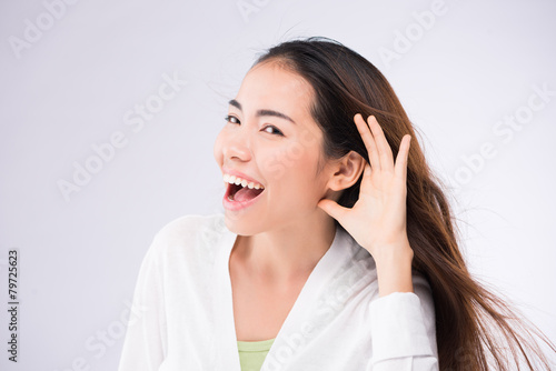 woman, young, concept, sense, beauty, asian, vietnamese, smiling, skin, beautiful, happy, healthy, person, portrait, ear, sound, gossip, hear, listening, secret, interested, curiosity, hand