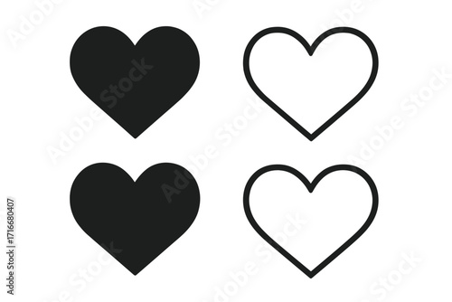 Heart icons set. Love symbol collection. Vector graphic of solid and outline hearts for Valentines day, romance, or web design. Simple minimalist flat illustration element.