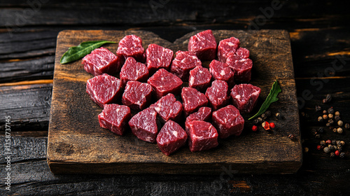 heart shape made from raw beef chunks with detailed texture, showcasing fresh red meat in a modern design with vast empty space, symbolizing infinite potentiality and chaos