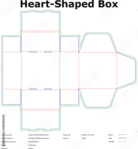 Heart shaped box die cut template vector design for packaging and manufacturing with dimensions and technical information perfect for valentines day packaging