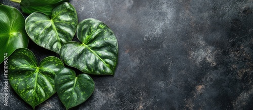 Heart shaped monstera leaves arranged on a dark textured background creating a perfect space for promotional or decorative text
