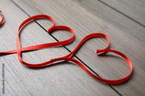 Hearts made of red ribbon on wooden background. Valentine's day celebration